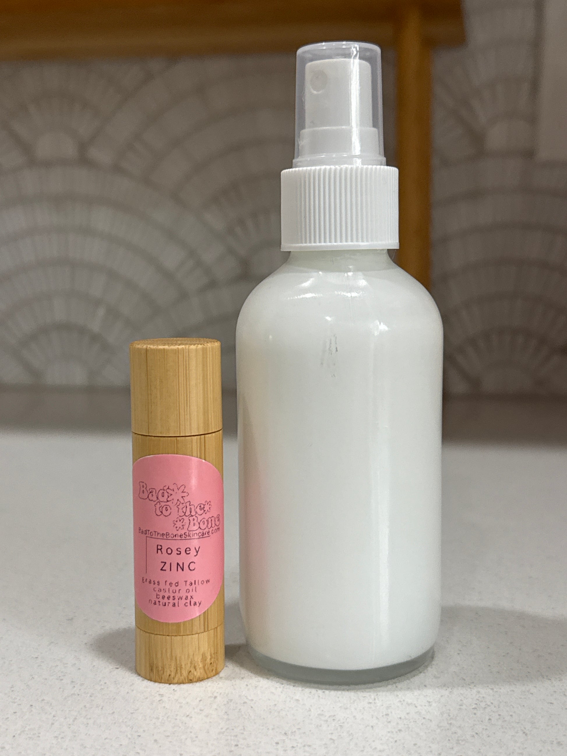 These two products are all you will need for an entire summer. The Rosey ZINC stick contains grass fed tallow, castor, oil, beeswax, zinc oxide, and natural clay. It goes on like a Chapstick so you can apply to your face, your lips, and small areas. The liquid zinc is bone marrow and tallow runoff oil with zinc oxide only. It has no odor and it spreads wonderfully. This is a limited time deal so snag it while you can!
